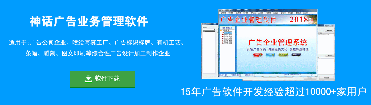 从业务接单、设计、制作加工、送货、对账、收款、仓库、外加工、采购、账务、材料管理等整个流程进行管理,软件内置: 批量自动开单、 自动识别尺寸、自动识别材料、自动识别价格、自动识别数量、自动识别客户、自动QQ接收文件、自动批量导出报表清单、辅助设置等功能,软件支持 自动识别,减少操作人员操作,免除了开错单的的烦恼,提高工作效率。